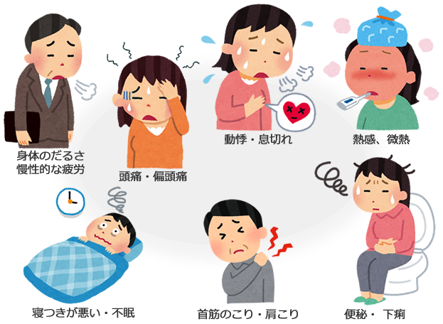 身体のだるさ、慢性的な疲労、首筋のこり、肩こり、頭痛、偏頭痛、めまい、頭重、頭部のしびれ、頭がぼーっとする、耳鳴り、瞼、目の下がぴくぴく動く、動悸、息切れ、ホットフラシュ(のぼせ、ほてり、汗)、熱感、寒気、微熱、口やのどの不快感、口の渇き、寝つきが悪い、不眠、夜中に何度か目が覚める、便秘、 下痢、手足のしびれ、頻尿、残尿感など
